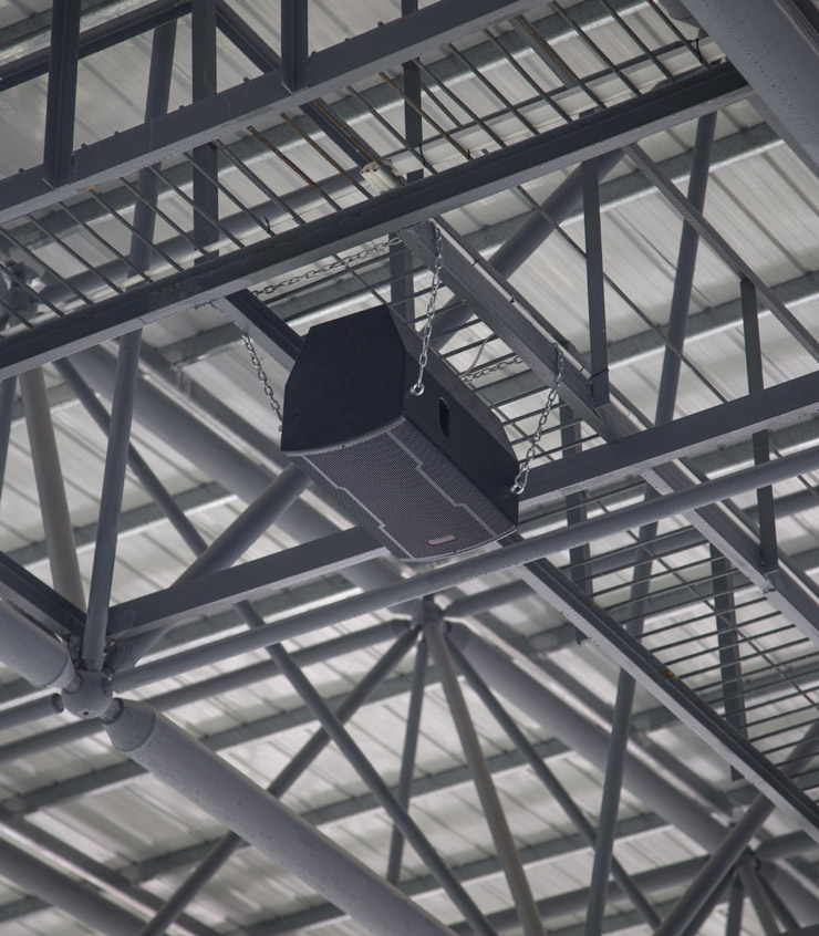 考慮到運動場面積廣和建筑特色等因素,中科音視采用ELA線性陣列音箱作為主擴音,搭配EKA系列專業功放,由于線性陣列的特點,在主軸垂直平面指向性呈窄波束,能量疊加可以遠距離輻射。而線性列的彎曲部分下端覆蓋近區,形成自近而遠的覆蓋,線性陣列音箱系統更適合應用于場地廣人數多的場合。中科音視選取的ELA-181SUB超低音音箱,音箱箱體結構采用導相式設計,并在箱體前方增加一開口腔體結構,以達到號角的作用;ELA-121全頻音箱系統結合電子分頻,免去了內置分頻的音質損耗,使音箱整體具有較高的靈敏度、準確的中頻表現和優異的高頻解析力。