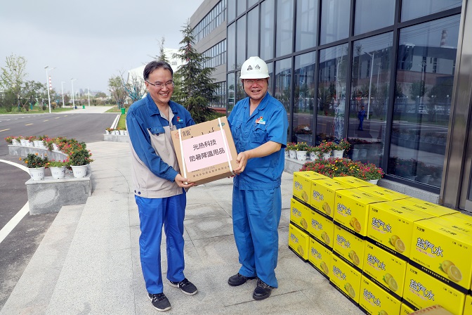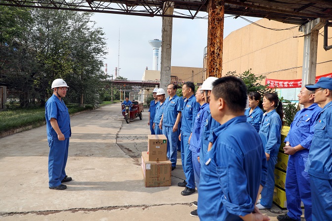 公司黨委副書記、總經(jīng)理陳志剛帶隊,先后來到動力廠、裝備制造廠、CNG加氣站、光熱科技、光伏新材料和安彩能源,為一線職工送去飲料、菊花茶、風油精、藿香正氣水、仁丹等防暑降溫藥品和物資,確保生產安全,職工平安度夏。